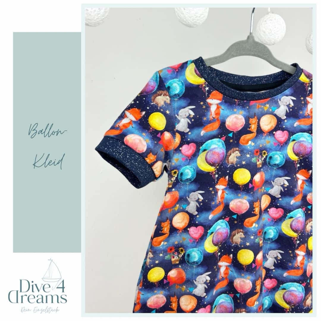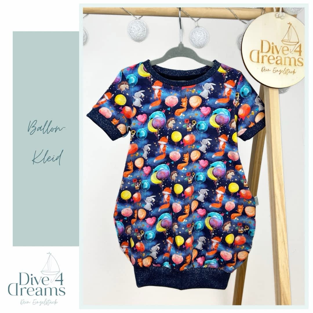 Das Ballonkleid wird einfarbig aus dem von dir ausgewählten Motivstoff genäht. Ich suche passende Bündchen dazu aus.