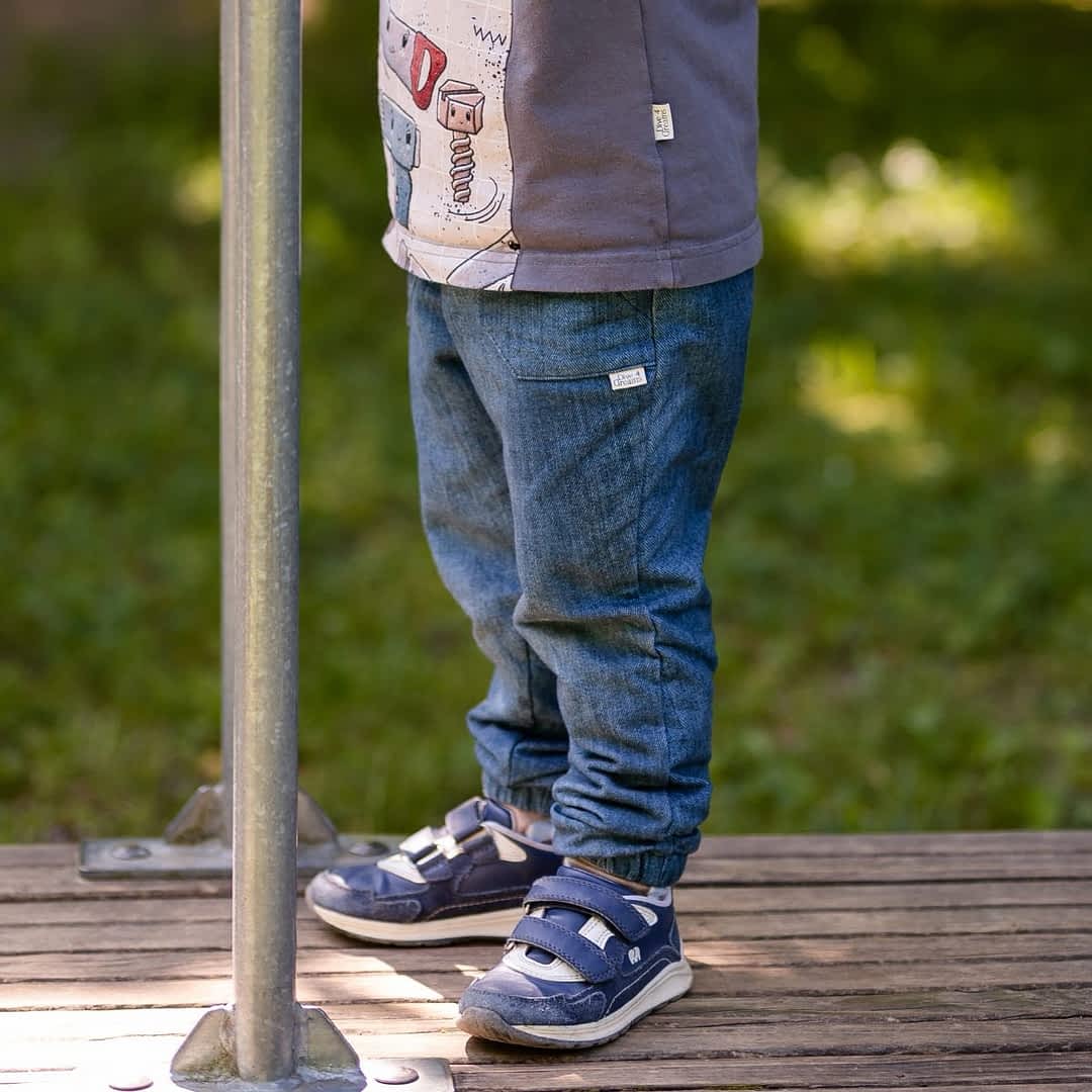 → Bequeme Kinderhose - Diese handmade Kinderhose sieht aus wie eine Jeans, der Stoff ist aber ähnlich einer Jogginghose. Sie ist bequem, gibt deinem Kind Bewegungsfreiheit und lässt sich leicht zu Oberteilen kombinieren.