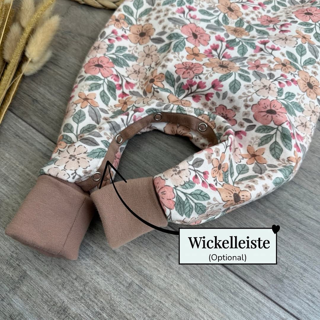 → Optionale Wickelöffnung: Auf Wunsch nähe ich dir den Strampler gerne mit Wickelöffnung. Diese wird mit den gleichen Druckknöpfen gemacht, die an den Trägern verarbeitet wurden.